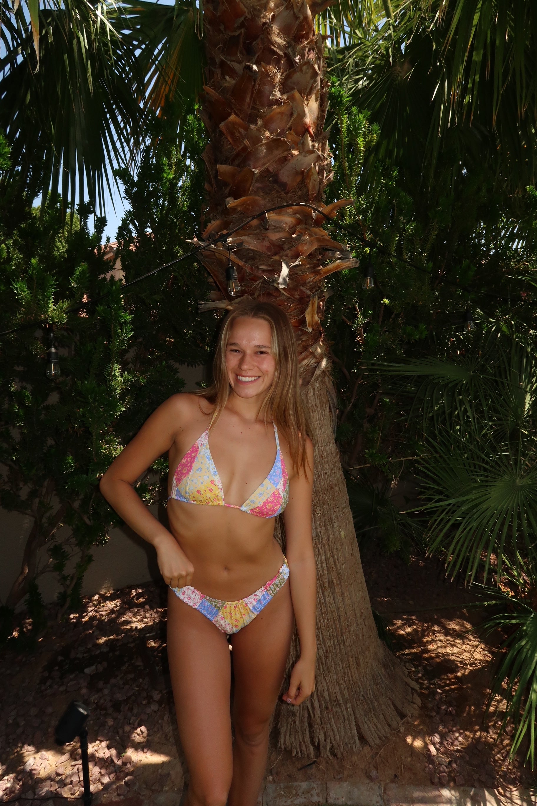 Meet your new fave throwback: the Patch Works bikini is all the retro-sweet energy you need this summer. With a patchwork of pastel florals, soft ruffle edges, and a flirty triangle cut, this suit brings cottagecore to the coastline. Cozy meets cute — and it’s made to mix, match, and make memories.